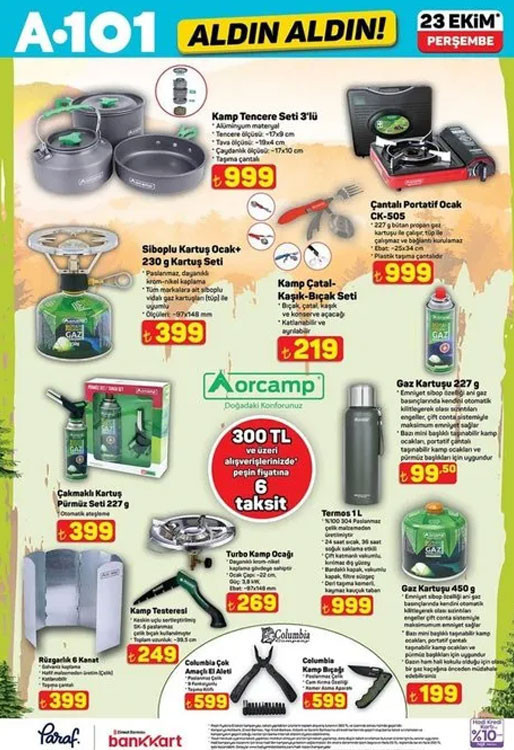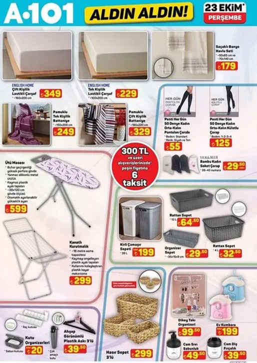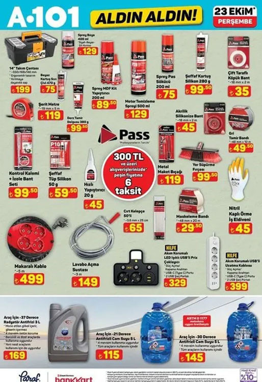 A101 bülteni ile Perşembe günü raflara gelecek ürünler paylaşıldı. 23 Ekim 2025 A101 indirim broşürü bu hafta da çeşit çeşit ürünleri raflarda satışa hazır olarak müşterilerinin beğenisine sunacak. A101 Aldın Aldın kataloğu bu hafta ürünleri arasında; 86 L mini buzdolabı 8.499 TL, 3’ü 1 arada stand mikser 4.999 TL, şarjlı masaj aleti 499 TL, rüzgarlı 6 kanat 399 TL, sprey pas sökücü 200 ml 75 TL, sprey MDF kit yapıştırıcı 200 ml 89,50 TL, araç için -30 derece radyatör antifirizi 3 L 169 TL, 26 cm kare fırın tepsisi 149 TL, ütü masaı 599 TL, kanatlı kurutmalık 299 TL, 3’lü hasır sepet 299 TL, oyuncak ışıklı pop it 229 TL ile satışa çıkacak. A101 Aldın Aldın aktüel kataloğu bu yine pek çok farklı ürünleri müşterilerin beğenisine sunacak. Peki A101 bu hafta bülteni neler sunuyor? İşte 23 Ekim 2025 A101 broşürü…