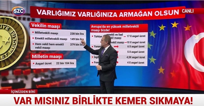 Türkiye’de verilen asgari ücret ile vekillerin aldığı maaşların arasındaki uçurumu vurgulayan Ekrem Açıkel, Avrupa ülkelerindeki milletvekili maaşlarını da göstererek vekillere seslendi.